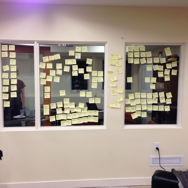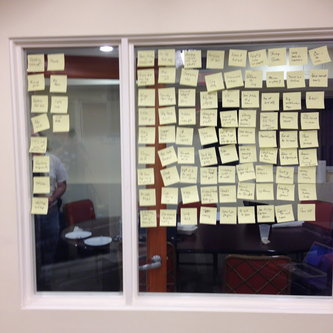 So, we've gone through the seminar for the Build Your Own Game process at the New England LARP Conference (NELCO). This was a bit unusual, in that we've all written LARPs before, so it went fairly quickly. We've now gone through the brainstorming, which has a lot of weird ideas on the board. Well, on the wall. We use Post-It notes, to capture all the ideas. There are no bad ideas. They all go up. A LARP will emerge from this... on Saturday.