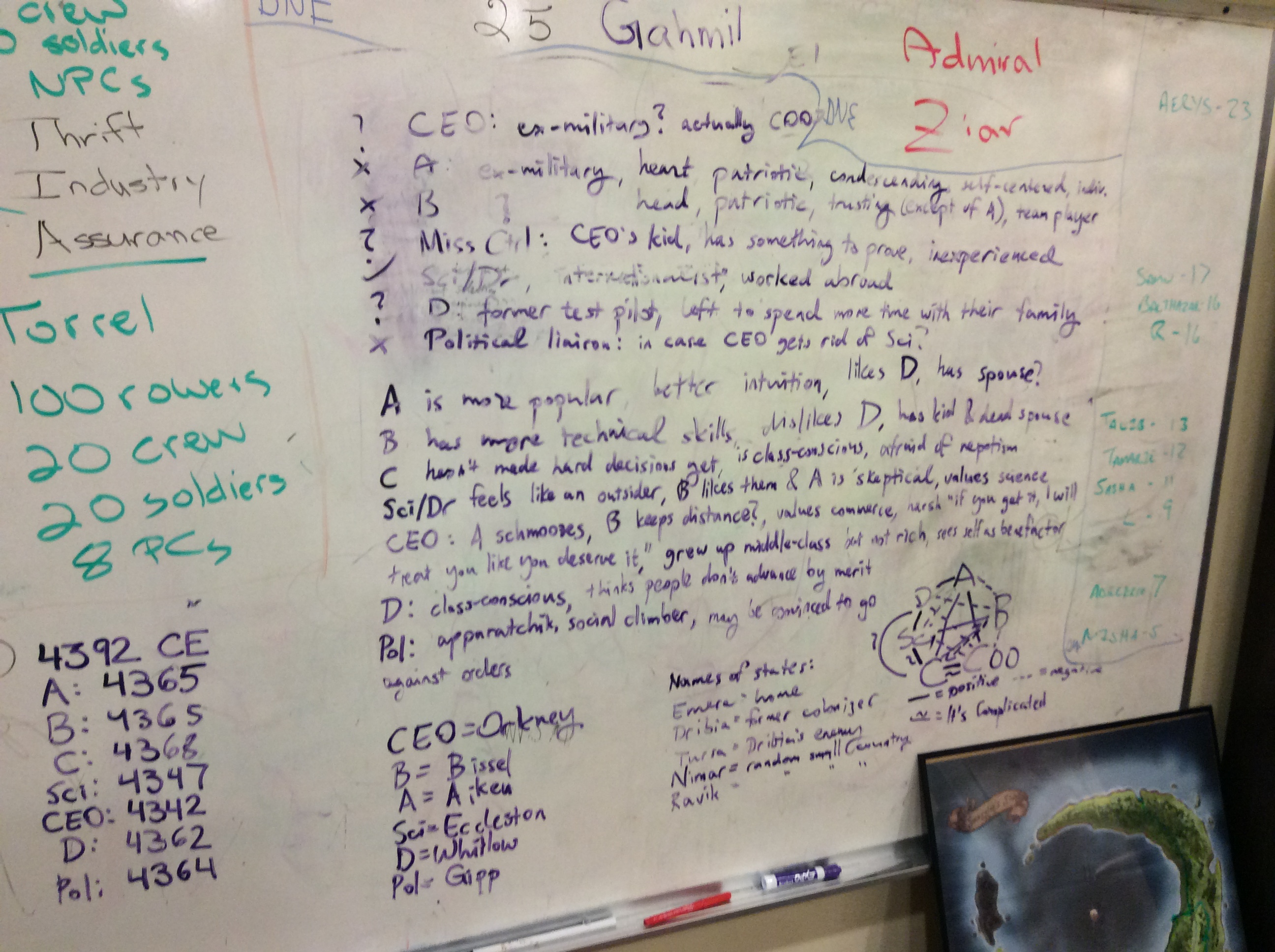The team working on characters have a very good idea who is who, and how they relate to each other. They were constrained in the space on the whiteboard, as information from one of the Camelot RPG campaigns already claimed sections of the whiteboard.