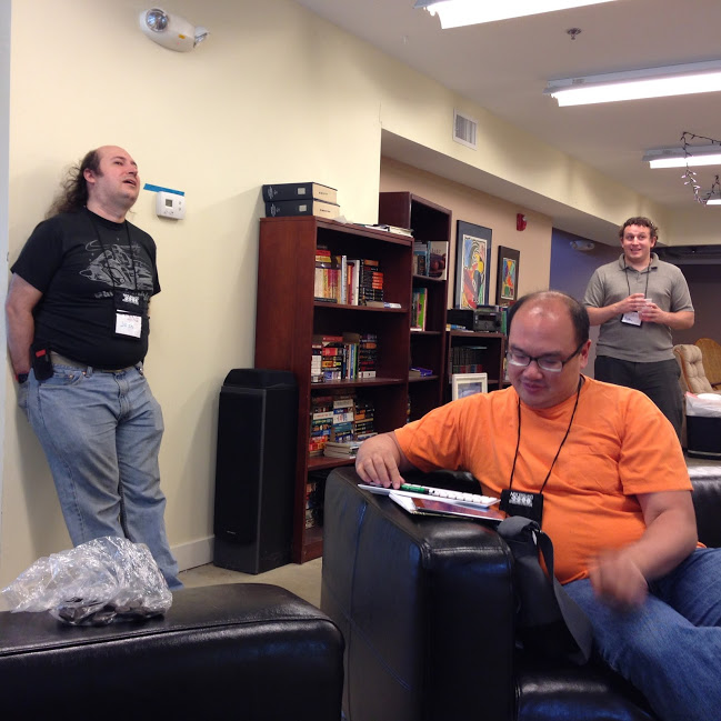 People drifted in to NELCO this morning, and the writing team for the Build Your Own LARP was all in place around 10:45 AM or so. There was a lot of discussion focused on six specific variants of the three themes we worked on last night, with a few new bits. The challenge with seven authors is finding a common idea that all are excited about. This includes the subject, but also includes the style of the game, what kind of tone we want to create, and allowing everyone to have a veto over things they don't want to write. It's always a challenge, but we settled on an idea that we can all get behind.
