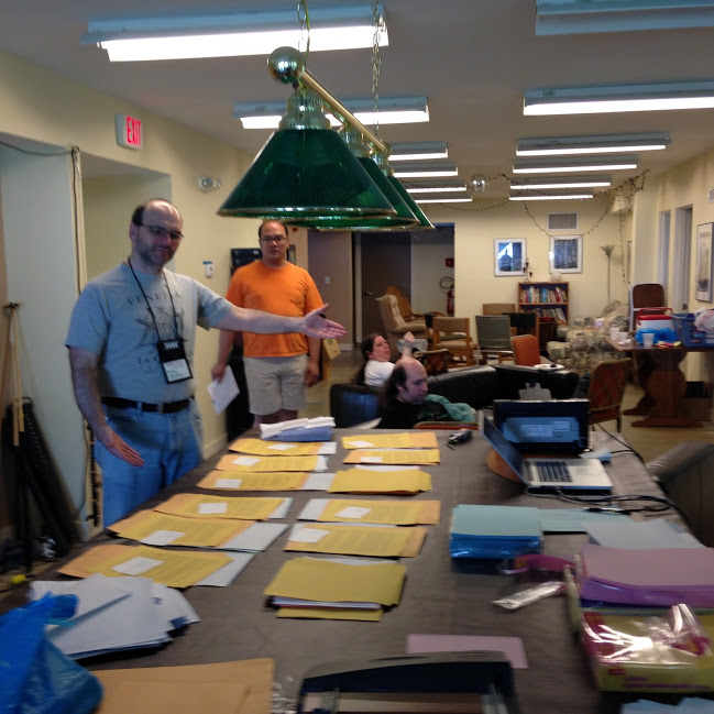 The result was two copies of the LARP stuffed and ready to go, within minutes of the appointed time! (No time for live blogging, though, which is why this and the next post come during the evening afterglow, before I finally crash for the night.)