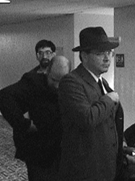This is the only image of the reclusive Austrian, as the group prepared for the adventure. The Austrian (Denis Roma) leads the Greek (Mike Young) and the Professor (David Lichtenstein).