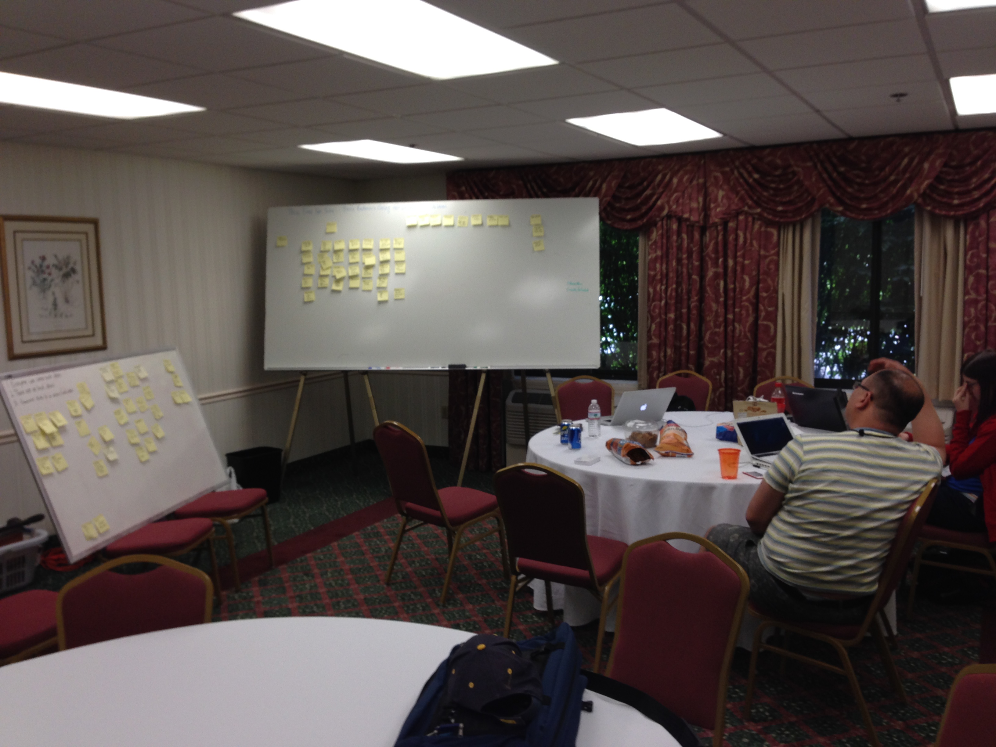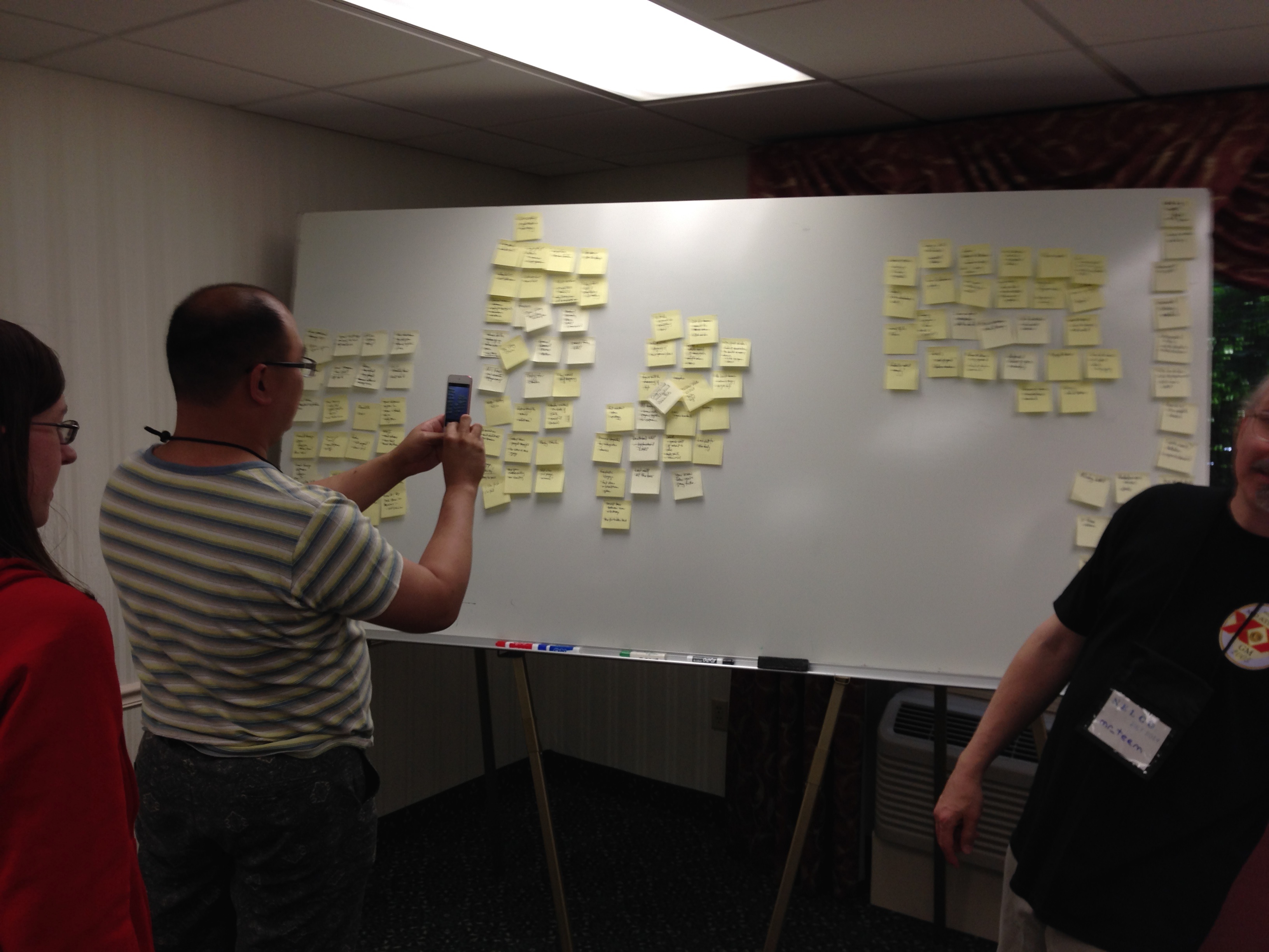 Rested and ready to go, we gather in the Concord room with our equipment, our munchies, our water and sodas, and a whiteboard full of Post-Its™. The first step is to coalesce the ideas into a set of clumps. Everyone goes to the whiteboard and starts moving Post-Its™. Again, there is no "right" or "wrong" place to this process. You move the Post-It™ into a group you think it belongs with. Others may have different ideas. Post-Its™ move, but, before long, they are in one of five groups.