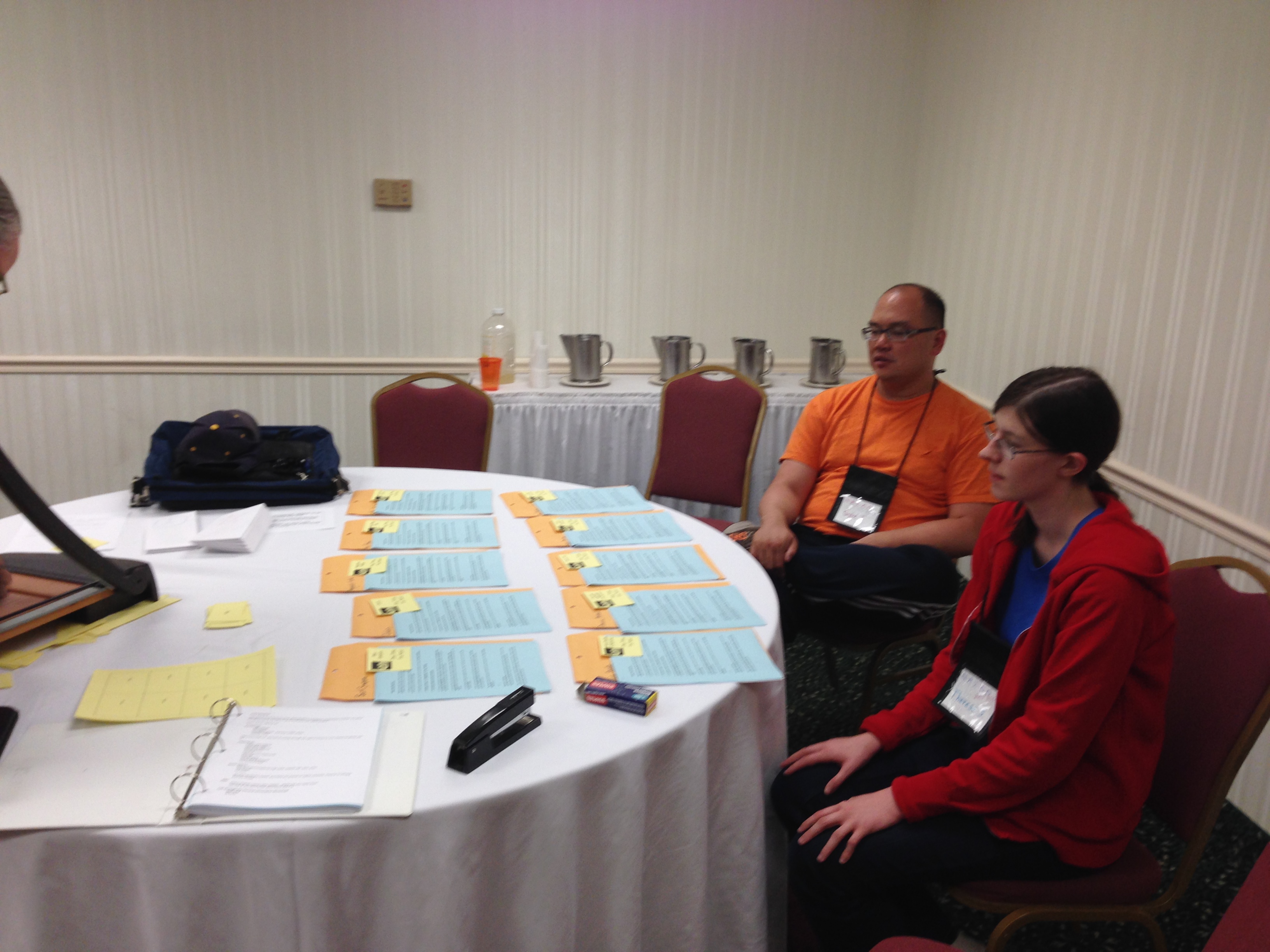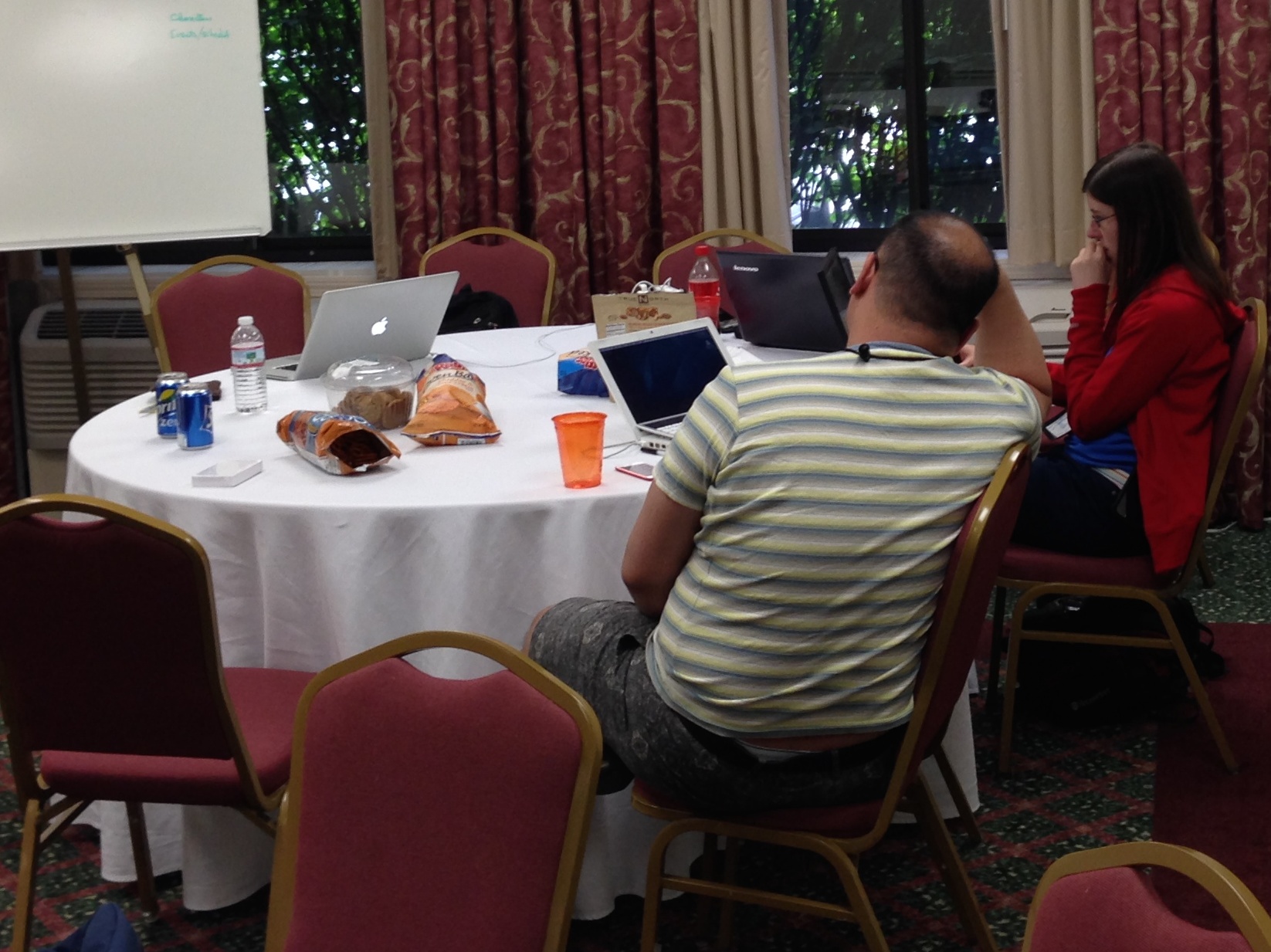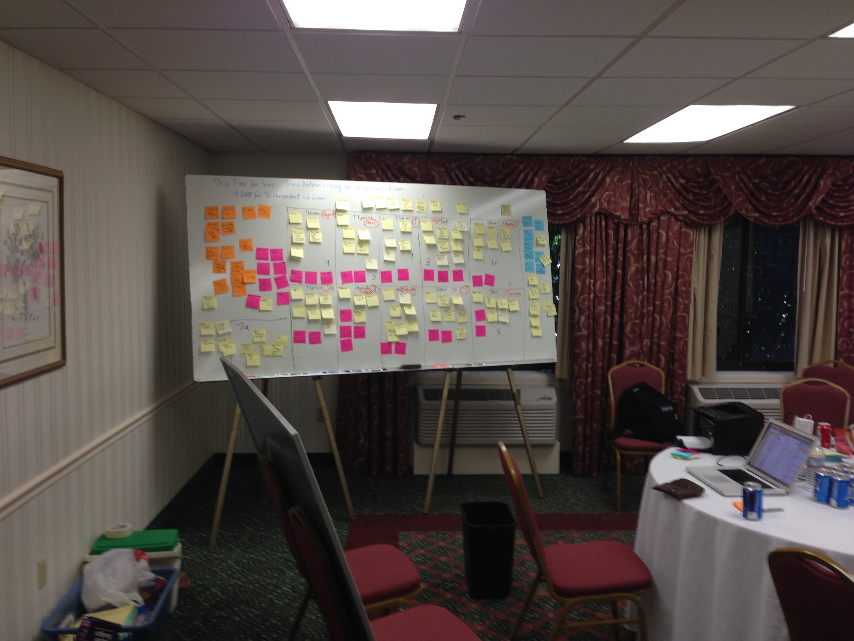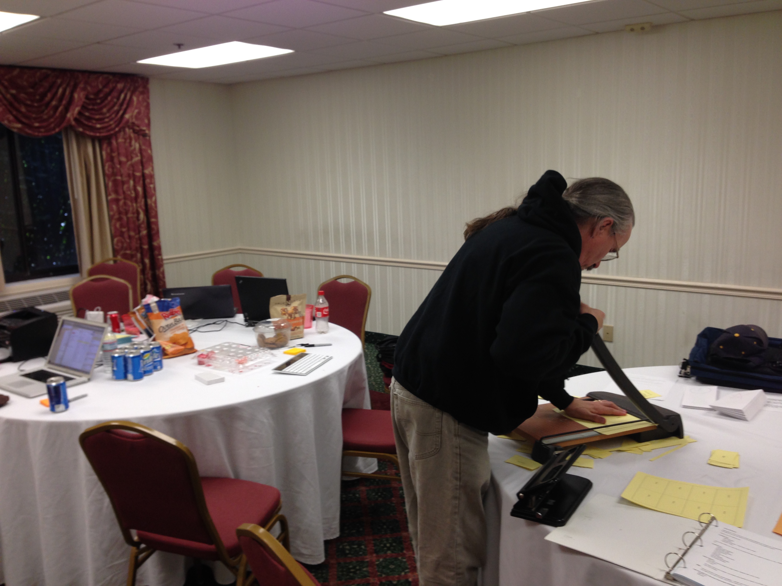 If you look closely, you can see my MacBook Pro, running OS X. I created a new Google Docs directory and shared it to the others. Theresa has her Windows laptop. Tim has his laptop that runs Windows 8. Gaylord has this Rube Goldberg contraption that marries an ancient iBook, a Bluetooth keyboard, and an iPod Touch for the display. I'm afraid to ask what he's actually running on that lashed up set of gizmos, but it works for him. With the hotel's WiFi, Dave Kapell's low-end laser printer, and my laundry baskets with LARP supplies, we have everything we need to crank out a game - including a lot more Post-Its™.
