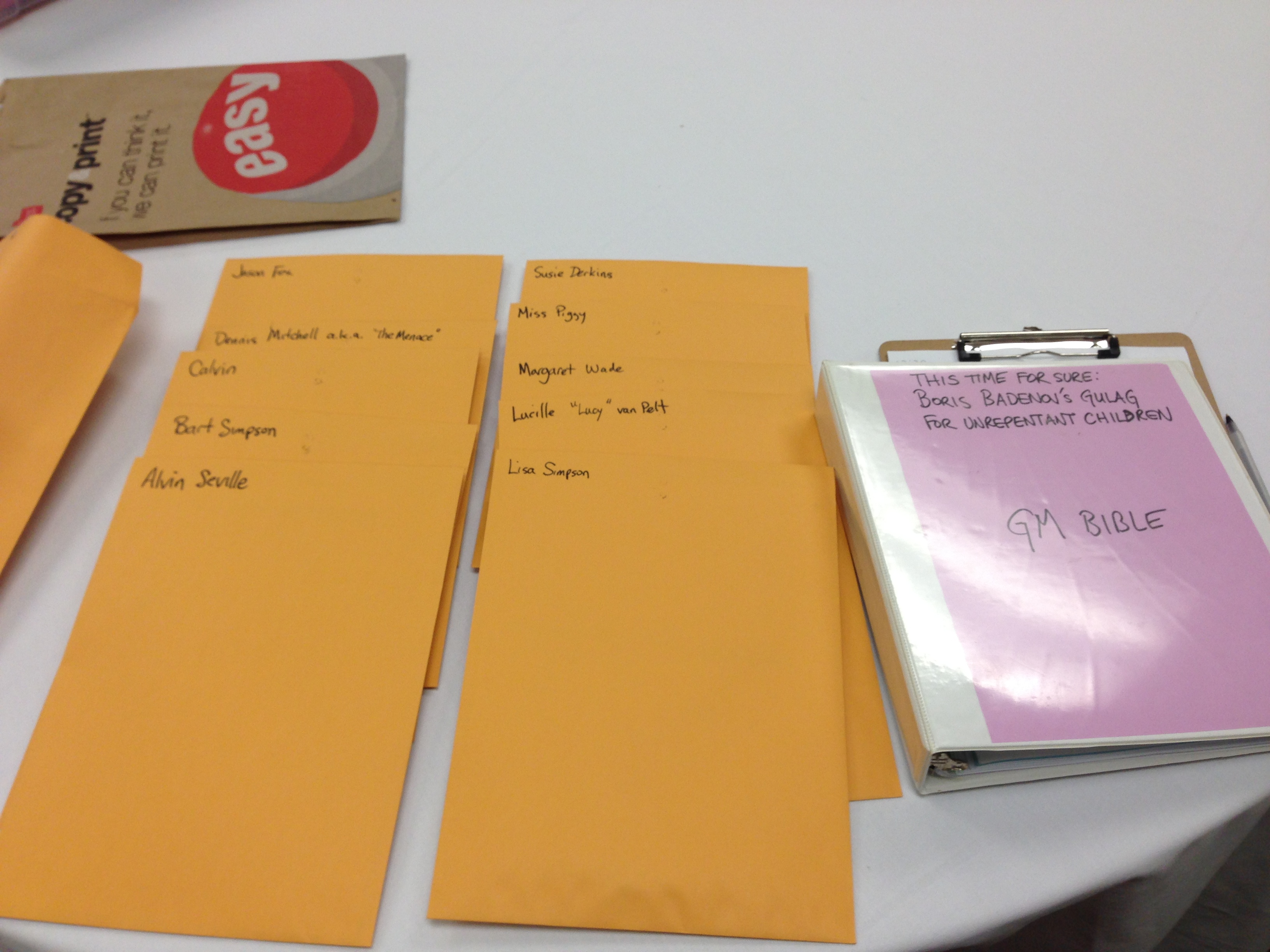 There is also an extra copy of every page, which goes into the GM Bible for the game. The GM Bible is the notebook with all of the game materials in it, which we can use at runtime as a reference. We can also pull pages out of it if someone loses something.