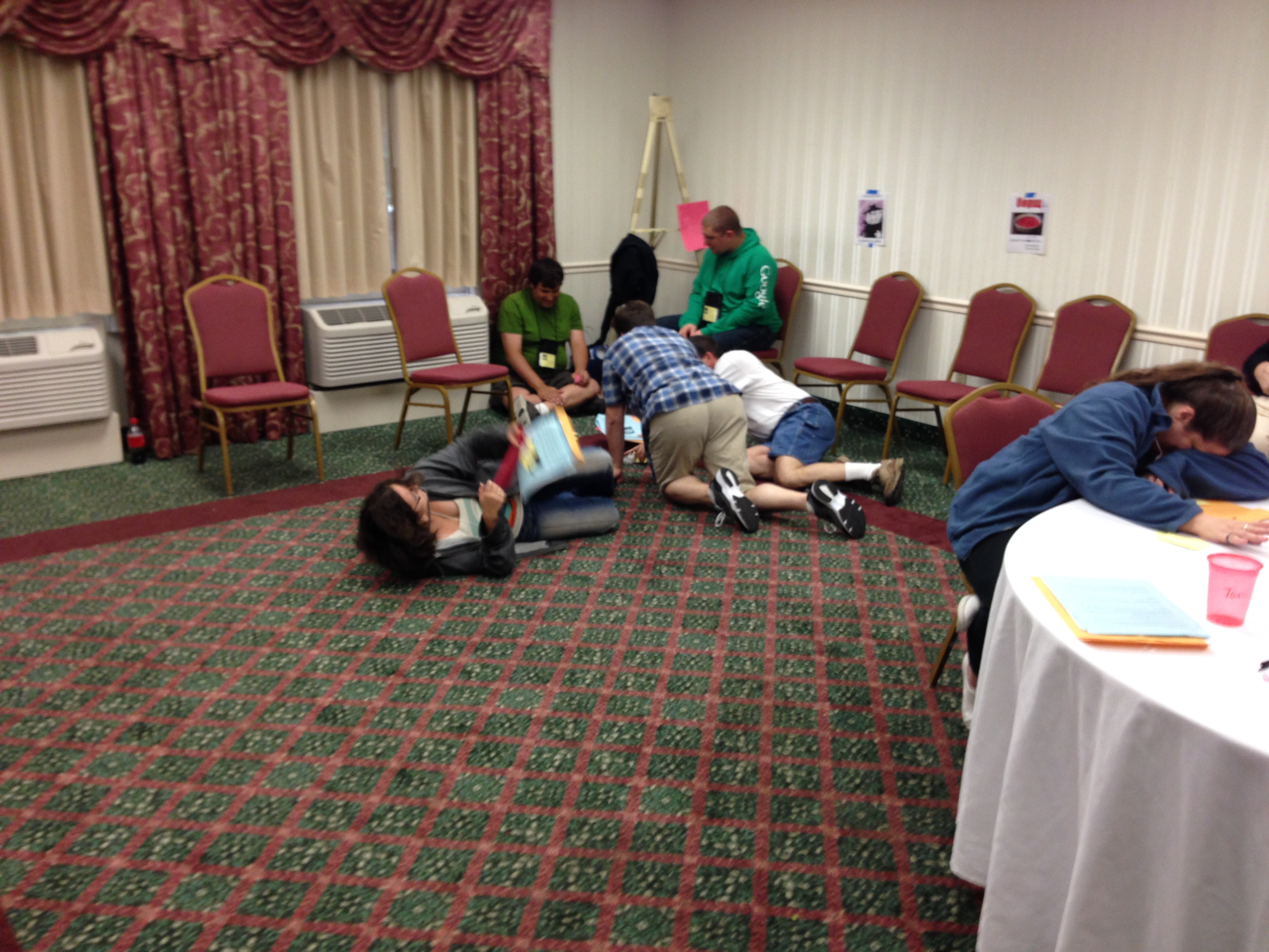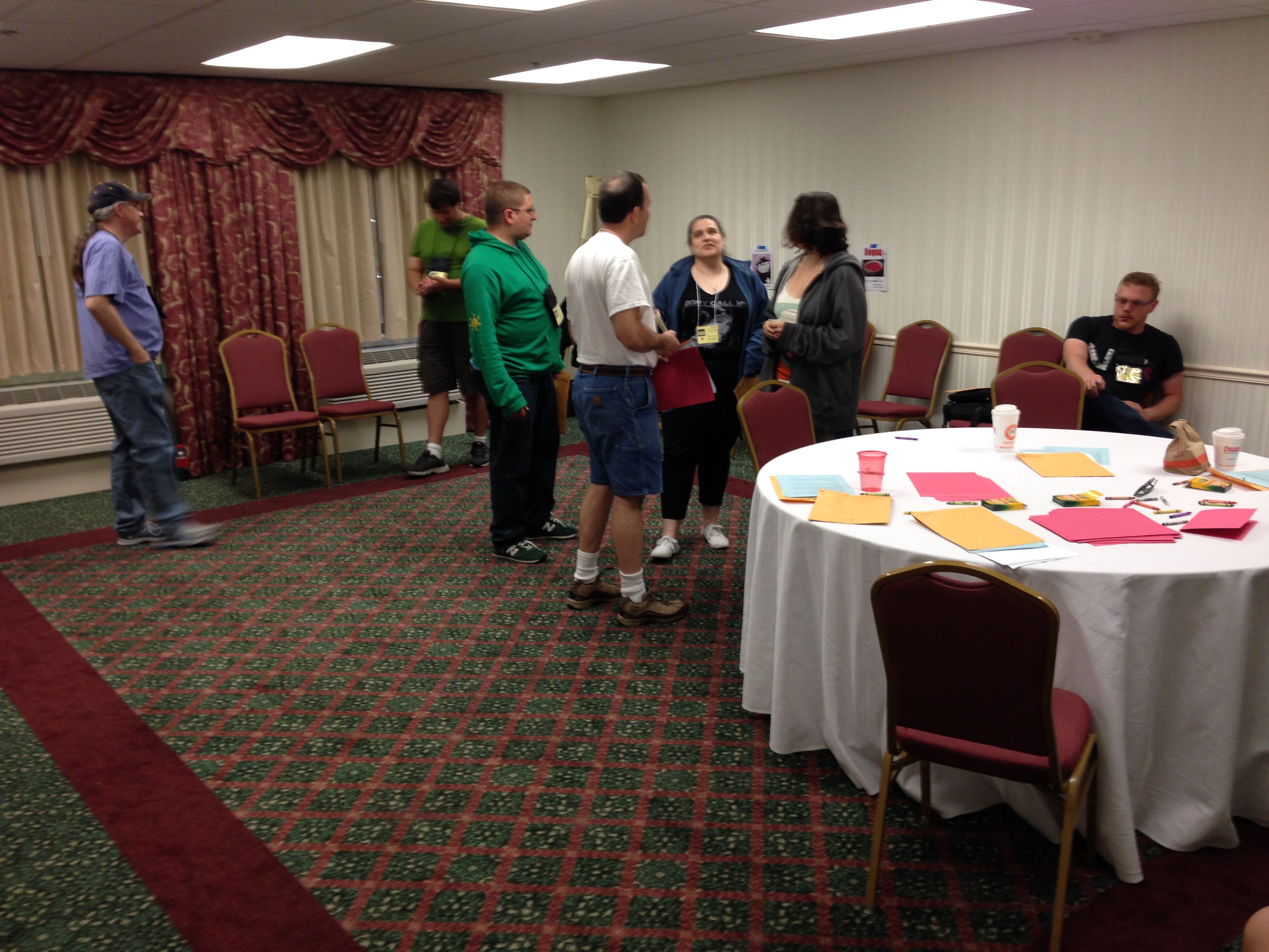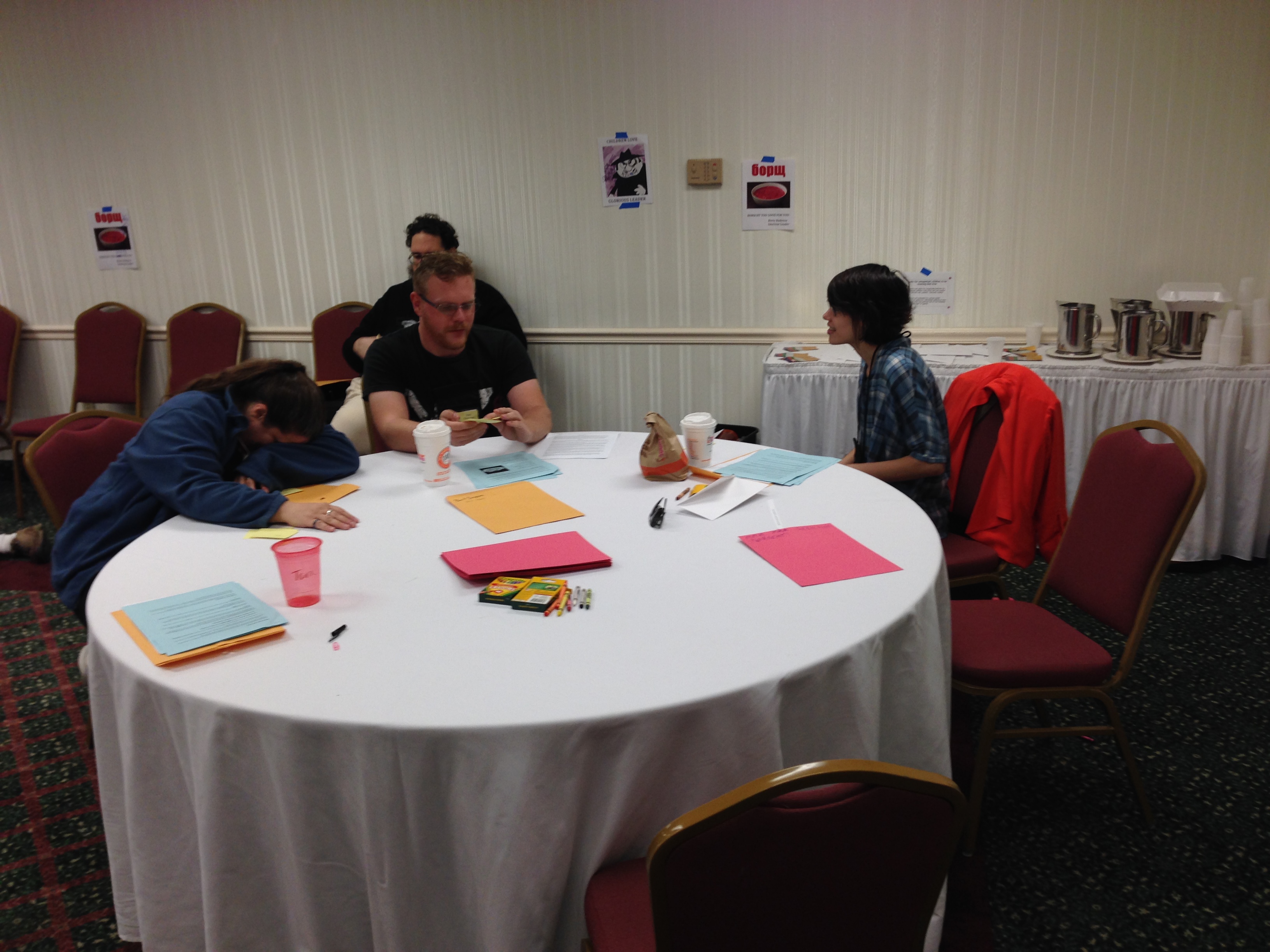 The inaugural run, after 22 hours of plotting and writing. We almost don't get off the ground because two signups dropped out and left the conference before the playtest. Fortunately, we find two wonderful people who can fill in the spots at the last minute. We start later than planned, but we start, with all of our slots filled. The players dive right into their characters, and really good things happen.